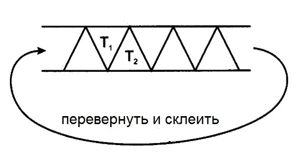 Еще одна очень простая конфигурация – треугольник – дает следующий наглядный пример тех неразрывных связей, что имеются между лентой Мёбиуса и разными загадками природы. Как известно, успехи многих физических теорий XX века в значительной степени были достигнуты благодаря отысканию «дуальностей». То есть таких эквивалентных математических конструкций, которые описывают вроде бы совсем разные вещи, однако в действительности одно и то же – из-за чего задачу, неразрешимую в одной системе, удается красиво решить в условиях системы другой, дуальной. Понятно, что это какая-то великая хитрость природы. Ну а прояснить, как эта хитрость устроена, помогает один малоизвестный факт из истории открытия ленты Мёбиуса.