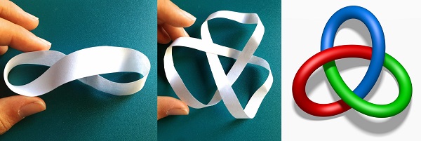 В топологии ленты Мёбиуса есть один известный фокус, имеющий непосредственное отношение к многослойному устройству природы и к схеме (3+2+1 = 6 = 2×3). Если концы ленты при склейке перевернуть не как обычно, на один «антипараллельный» полуоборот, а на три (3) таких полуоборота, то в результате получится вот что. Когда такую ленту после склейки разрезают по осевой линии пополам (2), а затем аккуратно ее расправляют, то в итоге получается цельная конфигурация (1), именуемая трилистный узел.