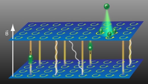 Ну а когда силу магнитного поля затем увеличили еще побольше, то получили сюрприз – в образце стали отмечаться признаки частиц проводимости с дробным электрическим зарядом. Поначалу – по аналогии с кварками в протоне – подумали было, что удалось обнаружить компоненты «неделимого электрона». Но проанализировав физику как следует, в итоге выяснили, что причиной стали особые вихри-квазичастицы в условиях 2-мерной электронной жидкости.