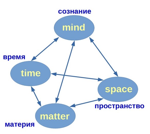 Иначе говоря, будь то математически, логически или интуитивно, но наука уже вполне определенно нащупала комплекс важнейших звеньев единства для разных проекций целого: «материя и пространство», «пространство и время», «время и сознание». А также «сознание и материя», естественно, коль скоро главным и бесспорным средоточием этой неразрывной взаимосвязи является человек, как несложно догадаться, а идею о «материи сознания» или Mind-Stuff еще в XIX веке выдвинул математик Уильям Клиффорд [3]. Единственное, что осталось, это соединить все изучаемые наукой проекции во внятную топологическую структуру, проясняющую устройство выявленных взаимосвязей в едином целом.