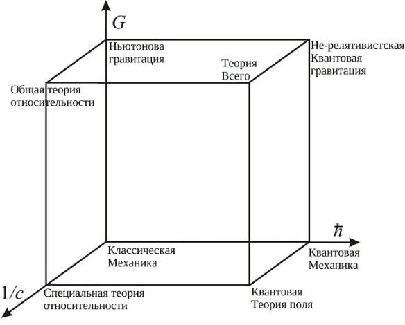 Размерности осей куба, помеченных этими константами, здесь не имеют значения. Оси протянуты от «нуля» в бесконечность, однако «единичные» вершины куба заданы вполне конкретными конечными значениями, – теми значениями констант, которые лежат в основе теорий современной физики. Эта схема представляет не столько какие-то конкретные физические теории или модели (несмотря на некоторые знакомые названия), но скорее более общие теоретические рамки для теорий. Её концептуальный смысл можно понять, двигаясь вдоль ребер куба, начиная от простейших теоретических рамок, то есть от классической механики, расположенной в начальной точке «0,0,0».