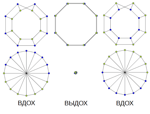 Если же процесс дыхания дживанов – как «перекладин» лестницы – отобразить по фазам вдоха-выдоха для обоих вариантов этой конфигурации в их взаимном сопоставлении, то можно увидеть еще одну очень важную вещь. Увидеть полную синхронность и тождественность этих процессов – дыхания каждого микроскопического дживана и гигантской вселенной во всей её совокупности. Вся материя и всё пространство в своих вдохах-выдохах сжимаются и расширяются как единое неразрывное целое.