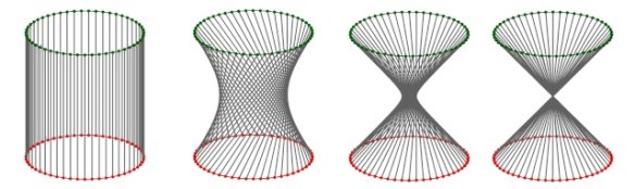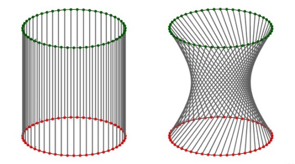 Если в такой конструкции одно краевое кольцо – или «базу фибрации» – повернуть относительно другого, то происходит маленькое математическое чудо. По-прежнему собранная из отрезков прямых, поверхность цилиндра превращается в гиперболическую поверхность отрицательной кривизны. А вся форма в целом, теперь именуемая «линейчатый гиперболоид», в своих проекциях-сечениях имеет, соответственно, и параллельные либо пересекающиеся прямые, и окружности / эллипсы, и гиперболы / параболы. Полный комплект базовых фигур геометрии, короче.