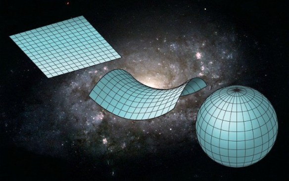 Как все, наверное, знают, наука наша до сих пор не может с уверенностью утверждать, какую геометрическую форму имеет космос. Ибо в теории известны три равно непротиворечивых формы геометрии – плоская евклидова (нулевая кривизна, сумма углов треугольника 180 градусов), искривлённая гиперболическая (отрицательная кривизна, сумма углов меньше двух прямых углов) и искривлённая сферическая (положительная кривизна, сумма больше 180).