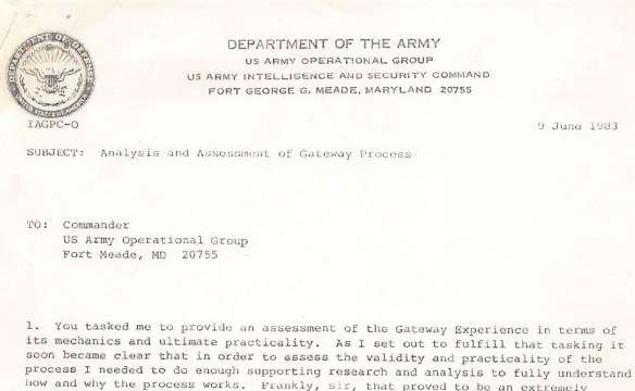 1983, 9 июня. В этот день появляется разведывательный отчёт «Анализ и оценка Процесса Gateway» (Analysis and Assessment of The Gateway Process), в котором аудио-психо-технологии Роберта Монро подробно исследованы сотрудником разведслужбы Армии США, подполковником Уэйном Макдоннелом (Wayne M. Mcdonnell). В этом документе автором предоставлен вариант научно-физического базиса для понимания таких феноменов, как опыт внетелесных переживаний, расширенное и изменённое состояния сознания. Именно этому отчёту, собственно, и посвящён весь данный материал.