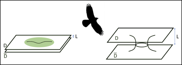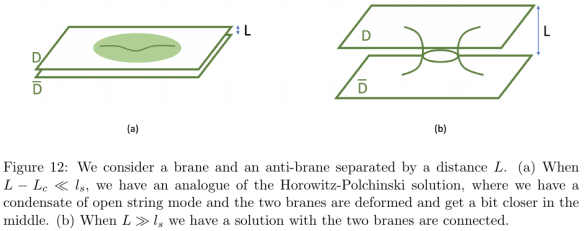 У авторов статьи на этой иллюстрации поясняется суть гладкого перехода от (a) решения Хоровица-Полчински для физики открытой струны в условиях очень близко сошедшихся мембран, именуемых брана и анти-брана, к решению (b) в условиях мембран разошедшихся, но теперь соединённых открытыми струнами – с концами на бране и антибране.