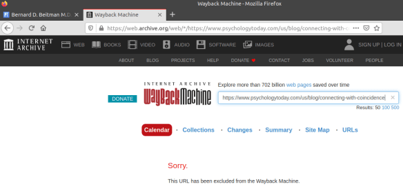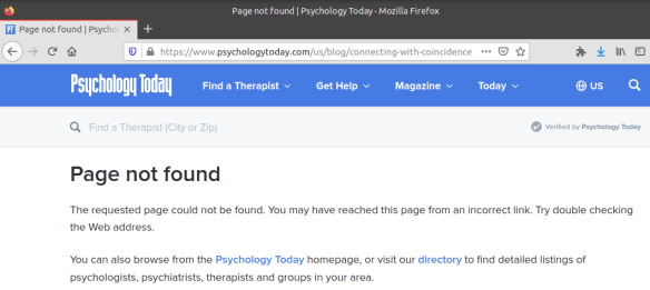 Начать следует с того, что у доктора медицины и психиатра Бернарда Бейтмана, автора породившей всю эту историю статьи, на сайте Psychology Today имеется личный блог, целиком посвящённый совпадениям-синхроничностям: Connecting with Coincidence. Но если вы ныне попытаетесь перейти в этот блог, кликнув по ссылкам, отправляющим на него со страницы автора или его публикаций, то получите в ответ унылое сообщение «страница не найдена».