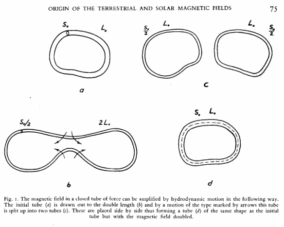 Ещё раньше, в 1919 г. Джозеф Лармор понял, что если не привлекать какие-то неизвестные фундаментальные взаимодействия (а такие попытки конечно были, но не увенчались успехом), то для объяснения космического магнетизма остаётся лишь явление электромагнитной индукции.