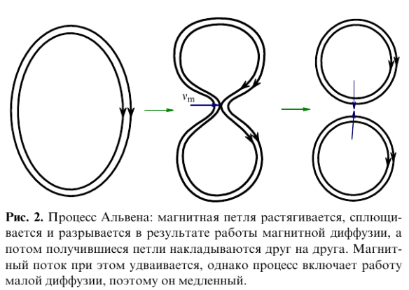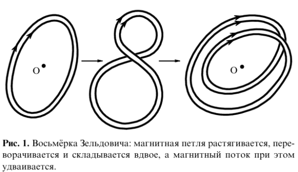 Созвучную картину эволюции магнитных линий предложил Ханнес Альвен (Alfven H. Rev. Geophys. 15 271, 1977). Разумеется, он ничего не знал о восьмёрке Зельдовича, схему процесса Альвена см. на рис 2.