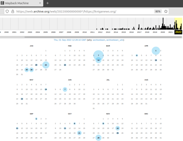 Как бы там ни было, вся эта возня с копированием записей сайта в интернет-архив поневоле заставила осмотреть критическим взором состояние всех предыдущих копий главной страницы kniganews. И вот тут-то в распределении голубых кружков, отмечающих даты создания копий, сразу же обнаружилась примечательная статистическая аномалия.