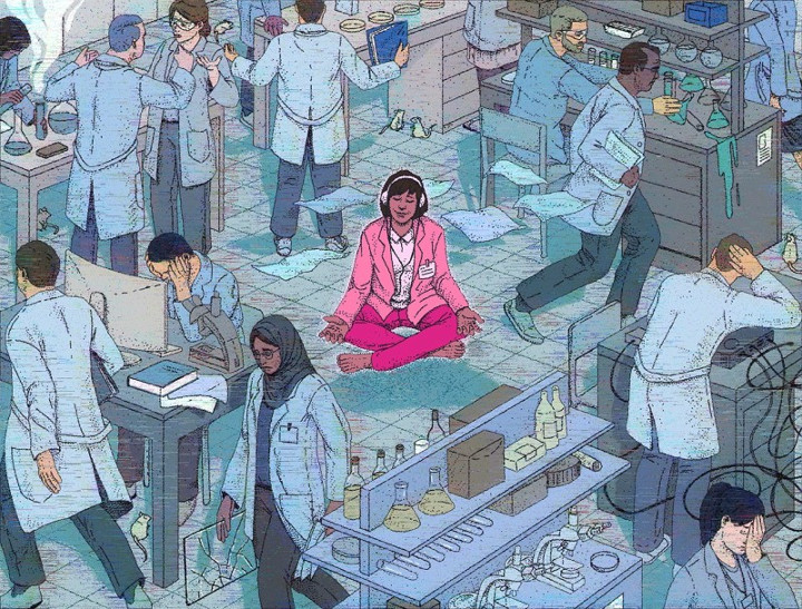 Теперь же, в июльском выпуске еженедельника NATURE (одного из самых авторитетных в мире научных изданий) опубликована обзорная статья о медитациях, предназначенных именно «для этого». Выражаясь более аккуратно, статья рассказывает о реально тревожных масштабах психологических проблем в большой науке и озаглавлена примерно так: «О том, как аспиранты и другие учёные сражаются с кризисом психического здоровья в науке» .