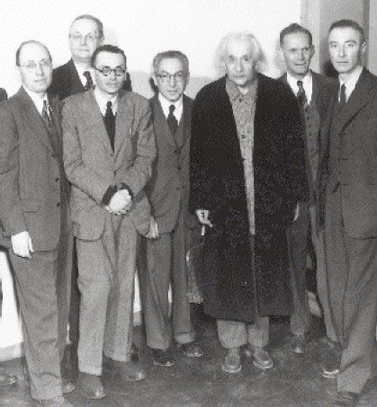 На илл: 1949 год. Учёные коллеги Альберта Эйнштейна поздравляют его в Принстоне с 70-летием. Обрезанная версия фотографии в книге Уилера.