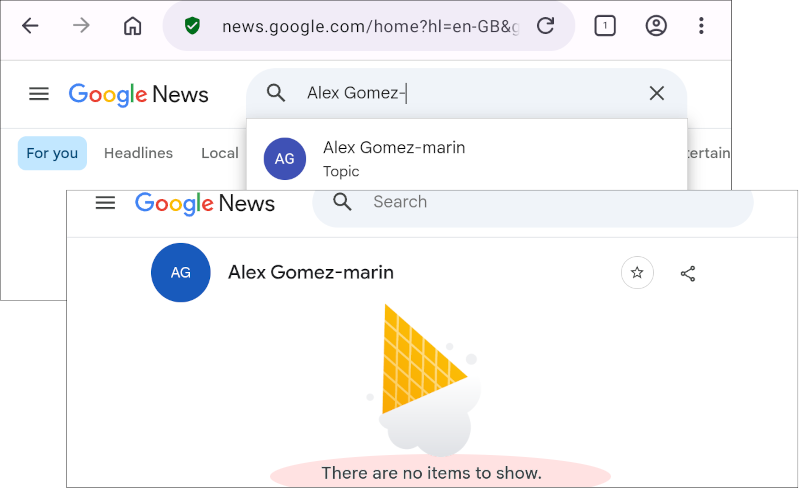 На илл.: Алекс Гомес-Марин выделен в отдельную тему, но по теме этой у Google News нет ничего.