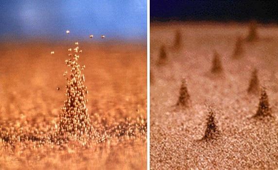 Настоящее открытие произошло тогда, когда толщину слоя засыпанного в контейнер материала увеличили до глубины 17 шариков. В этом случае стали наблюдаться спонтанные зарождения совершенно новых одиночных структур, чем-то напоминающих всплеск воды в луже, но с одним очень важным отличием. После всплеска эта структура – названная открывателями осциллоном – не размазывается по поверхности, а вновь собирается в столбик, который затем снова плюхается вниз.