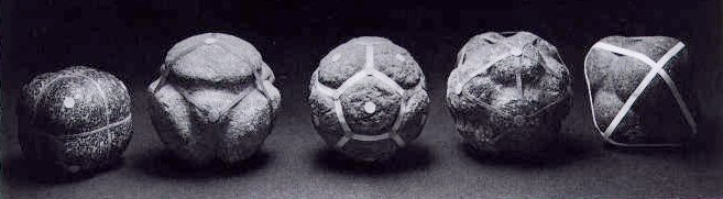 Есть, правда, одна весьма правдоподобная гипотеза, согласно которой предметы эти относятся не столько к римским завоевателям, сколько к культуре местных племен и народов, издревле населявших перечисленные территории. Вполне возможно, что имеется какая-то прямая связь между додекаэдрами римского периода и множеством куда более древних каменных шаров с вырезанными по их поверхности правильными многогранниками. Такие шары-многогранники, датируемые периодом между 2500 и 1500 годами до н.э., находят в Шотландии, Ирландии и северной Англии.[3]