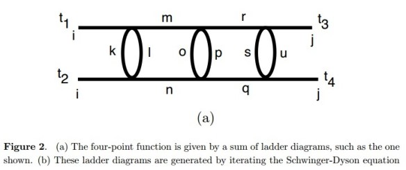 Имеет смысл обратить внимание, что основу конструкции – или «ядро» – этой лестницы образуют четыре специфическим образом расположенные частицы – «две пары антиподов», регулярно повторяющиеся снова и снова. Это очень важная конфигурация. Потому что когда Алексей Китаев нашел решение для SYK с опорой на четверки частиц, то довольно скоро выяснилось, что они сами укладываются именно таким вот образом – как «лестничные диаграммы».